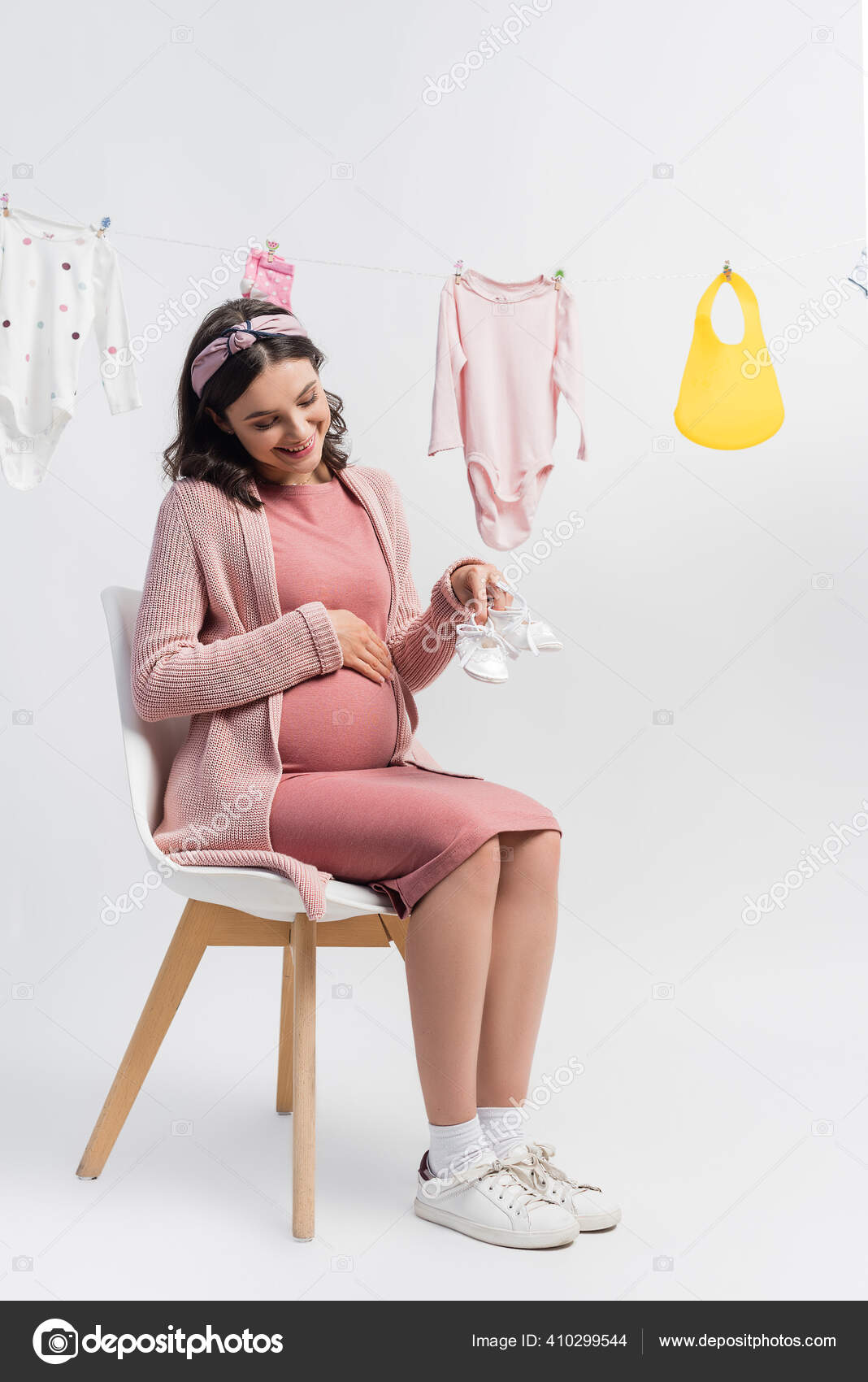 Pleased Pregnant Woman Holding Tiny boots tiny baby clothes