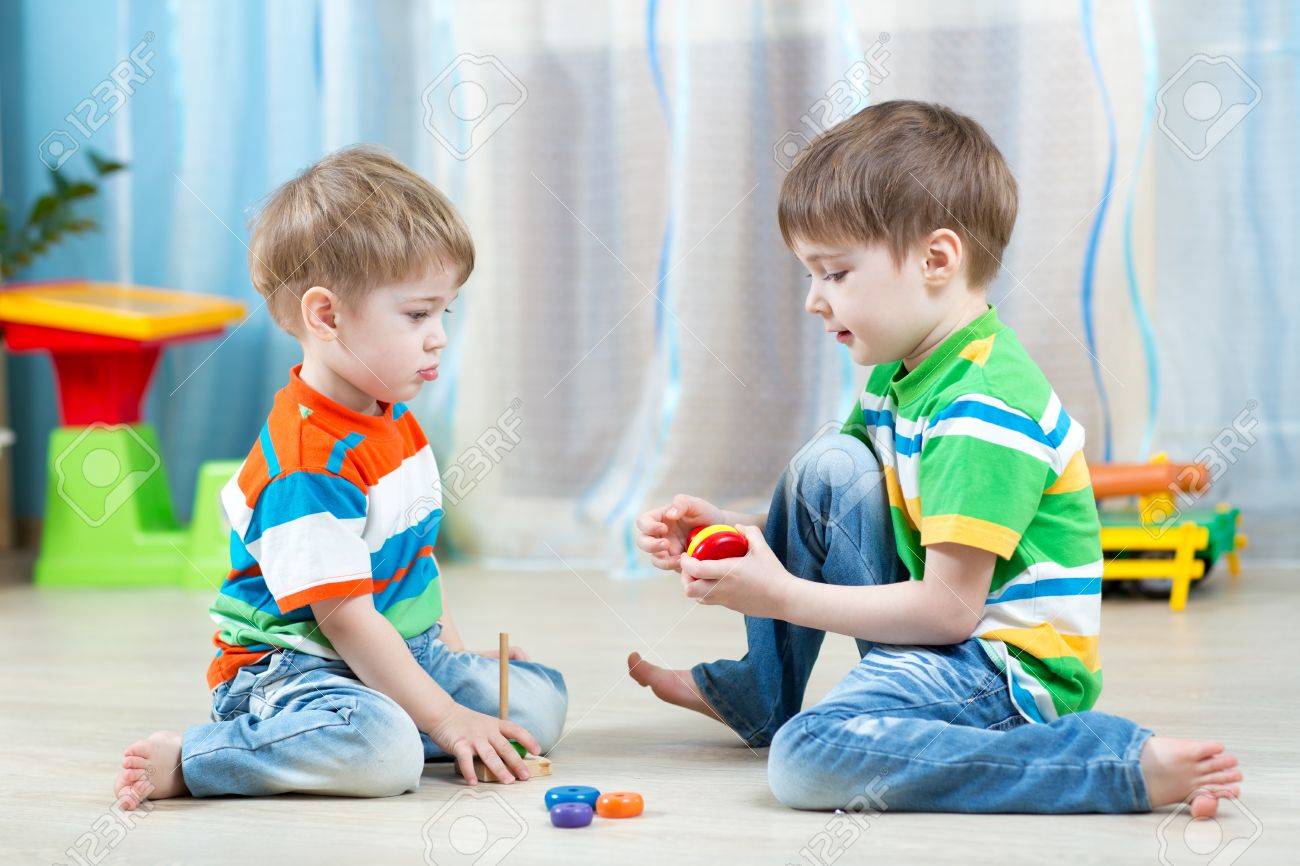Two Kids Play With Wooden Toy Sitting kids sitting toys