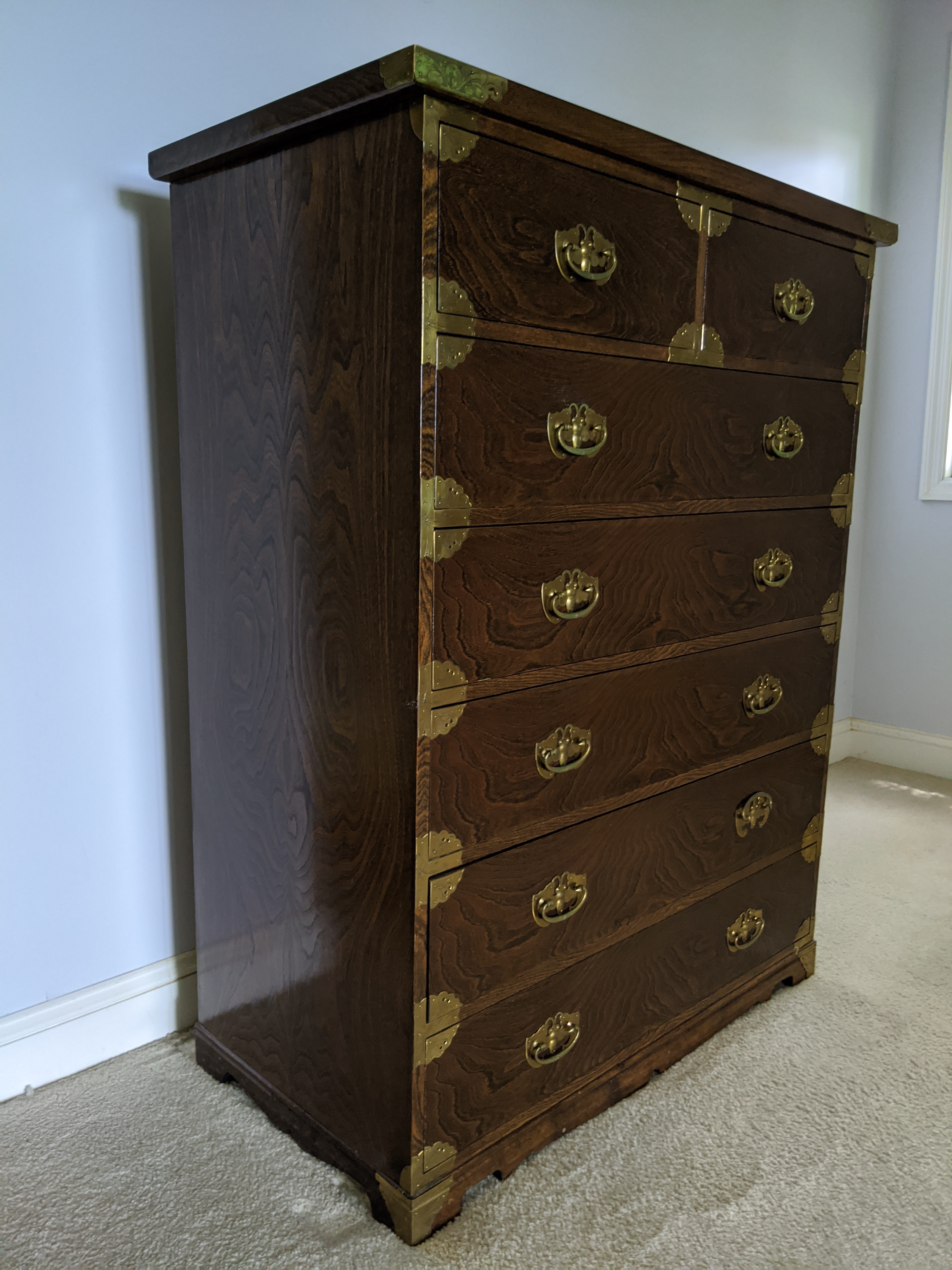 Antique Chinese Tigerwood Oak 7-Drawer 8 drawer tallboy