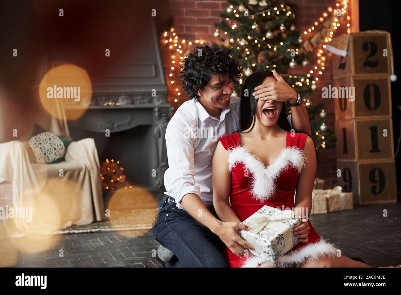 positive emotions. Man making surprise new year surprise for girlfriend