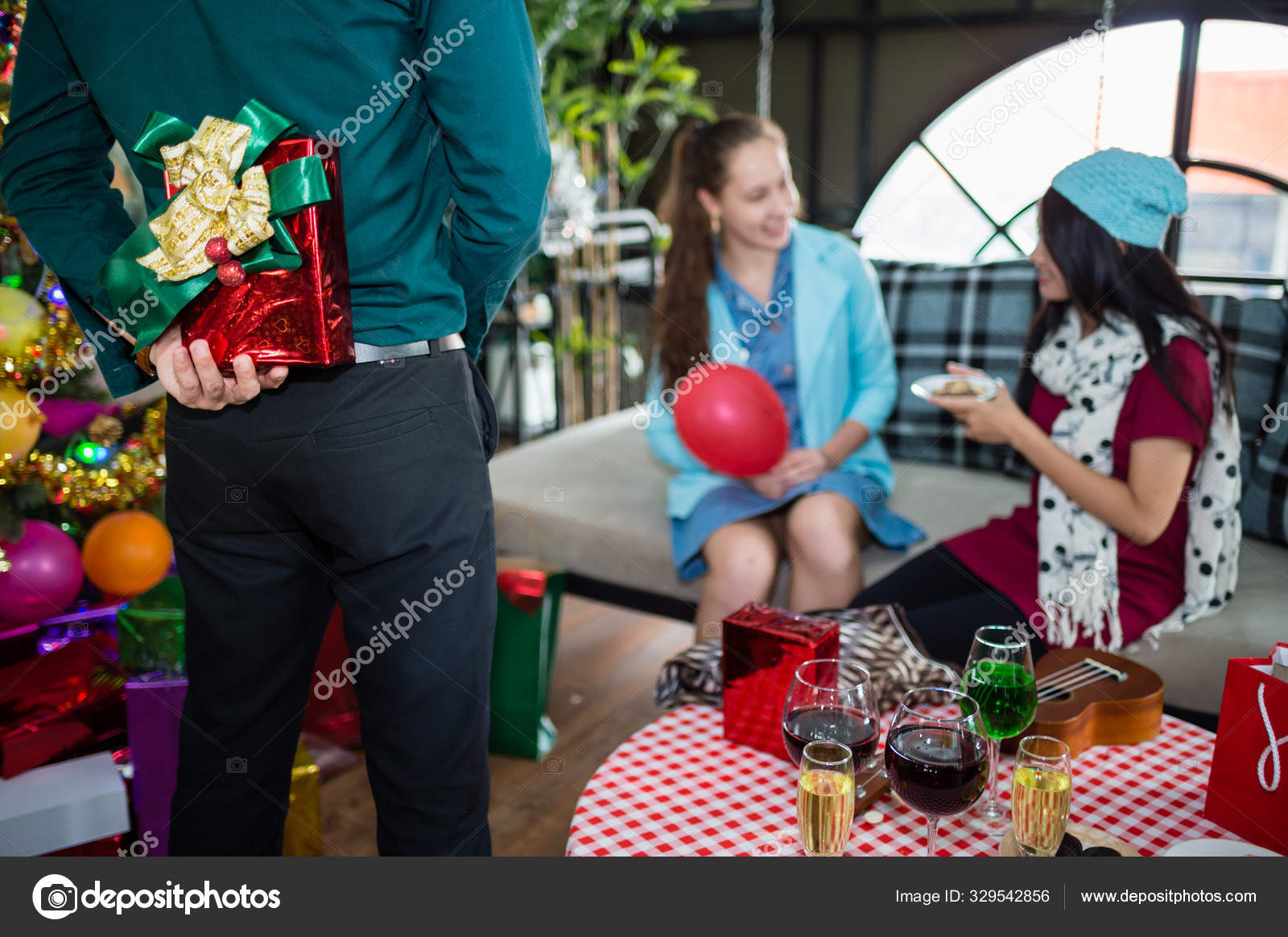 Man hide red gift box backside for new year surprise for girlfriend