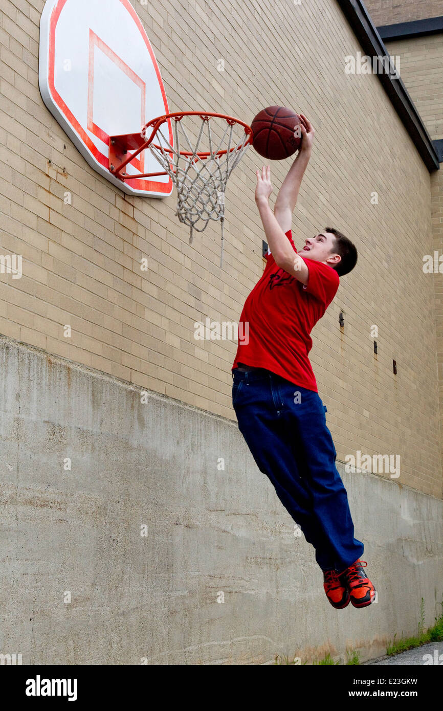 Boy dunking basketball in hoop Stock white boy dunking
