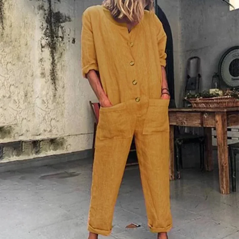 Women's Cotton Linen Jumpsuits Buttons long sleeve linen jumpsuit