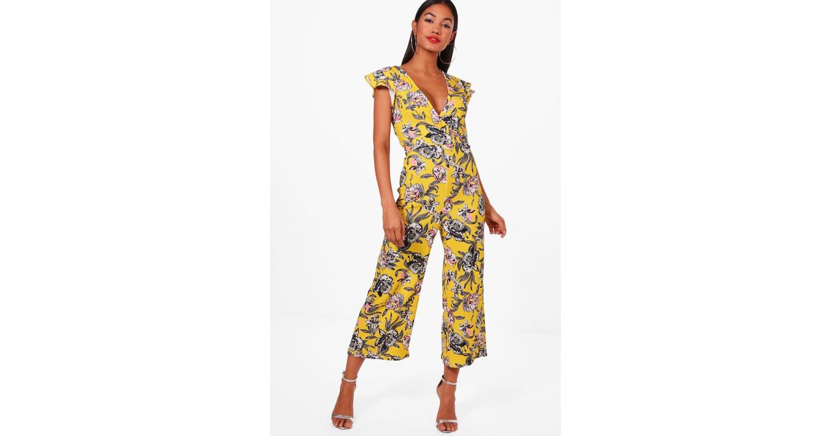 Boohoo Denim Frill Shoulder Floral yellow jumpsuit boohoo