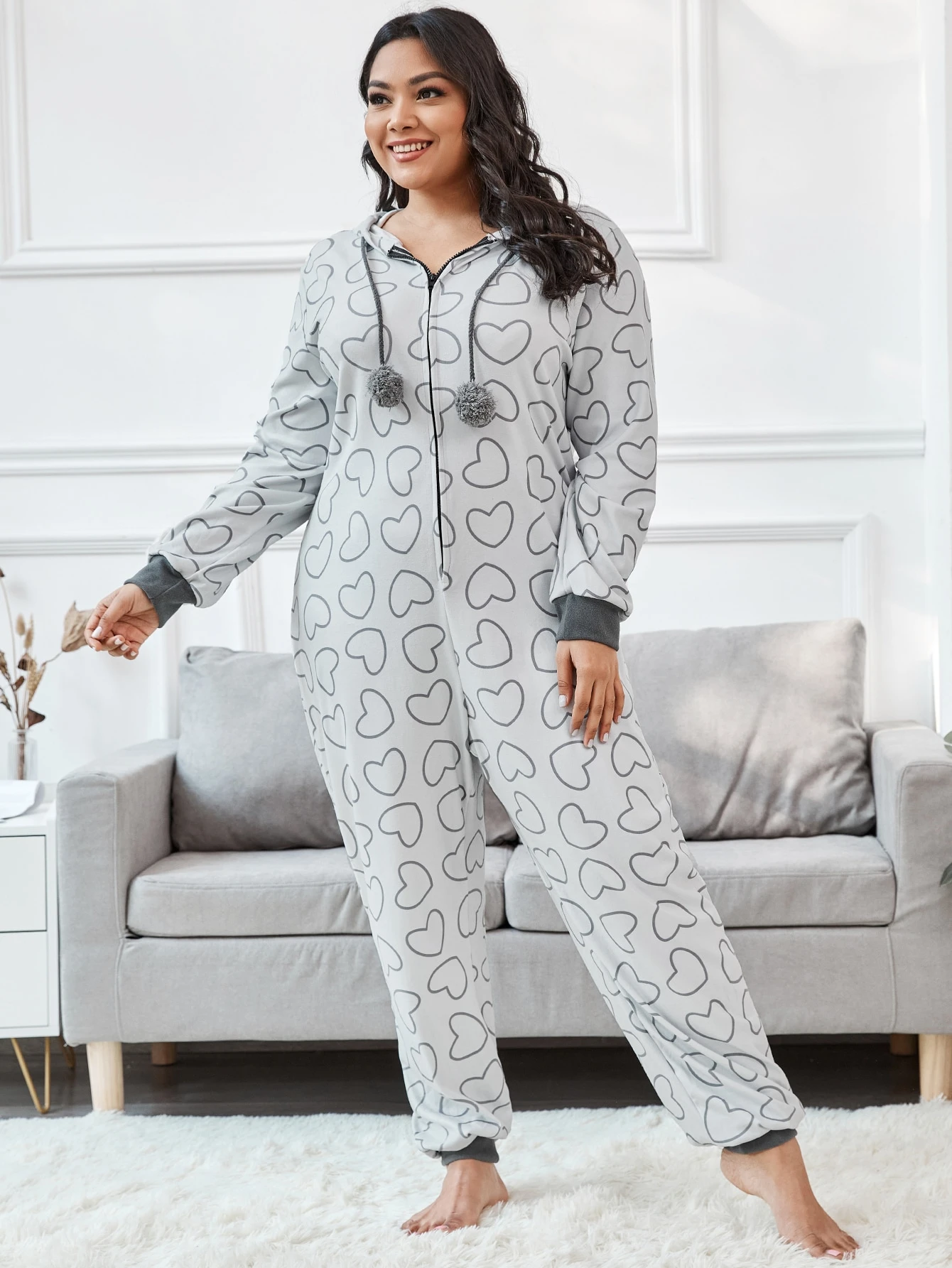 Plus Heart Print Drawstring Hooded jumpsuit sleep