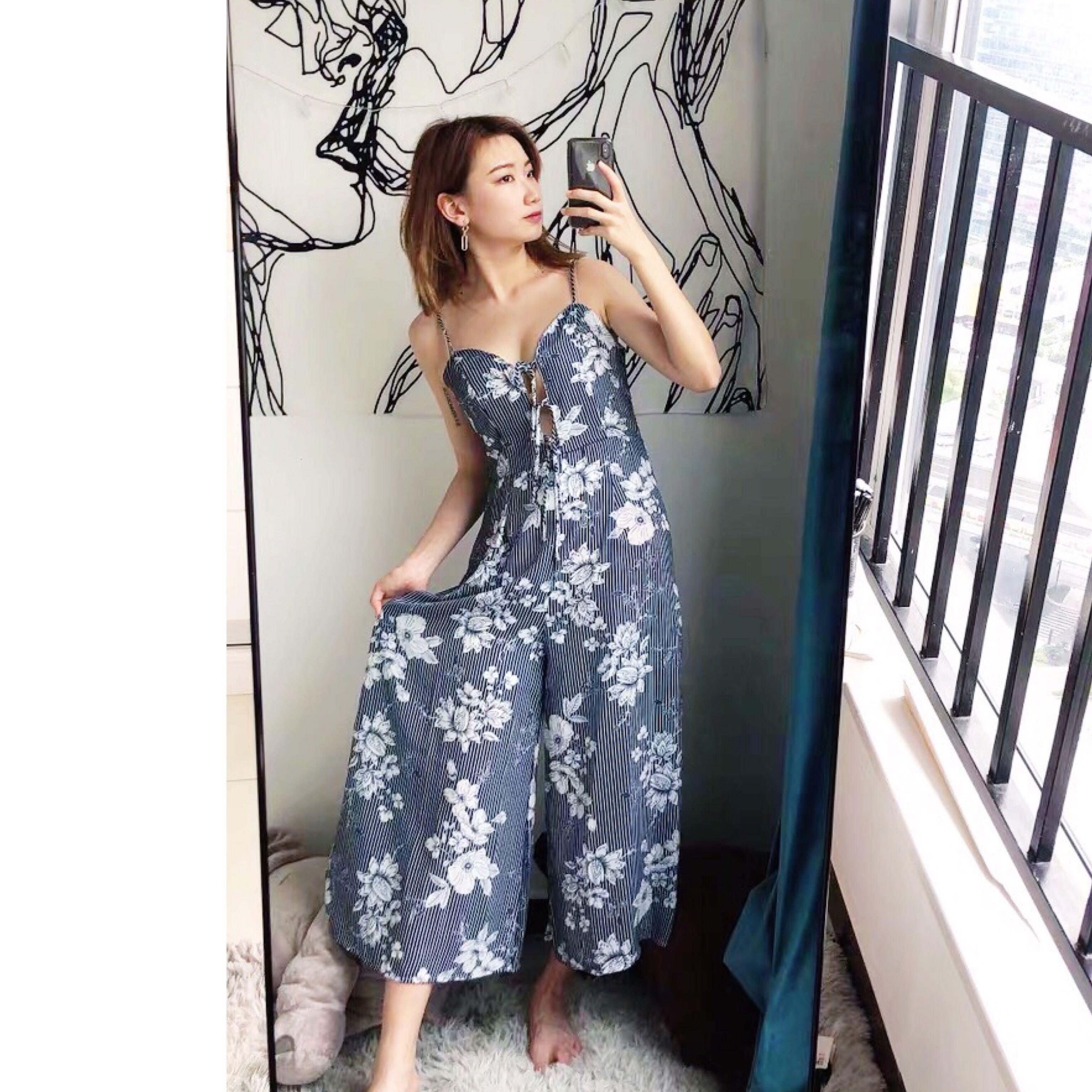 BN] Navy Floral Stripe Bow Tie Front navy striped tie bow palazzo jumpsuit