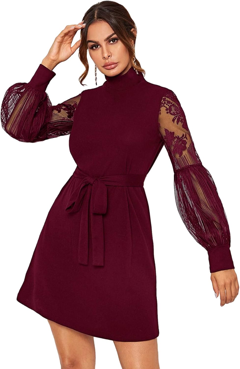 Romwe Women's Mesh Bishop Sleeve Mock solid lantern sleeve mock neck jumpsuits